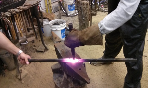 The whole center where the two pieces of steel meat was heated up until it glowed, and then we beat the two pieces together, effectively welding them together.
