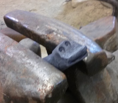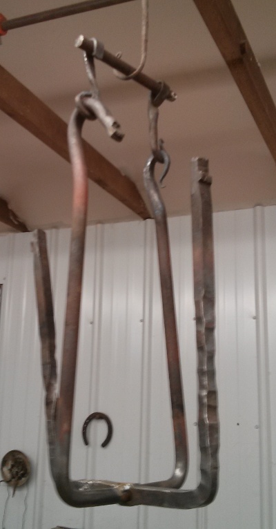 The hanger bar (laying down with the dragon head on the lower left, and tail sticking out on the right) was threaded through the hole drifted in the counterweight holder. This had to be done while the "tail" was still