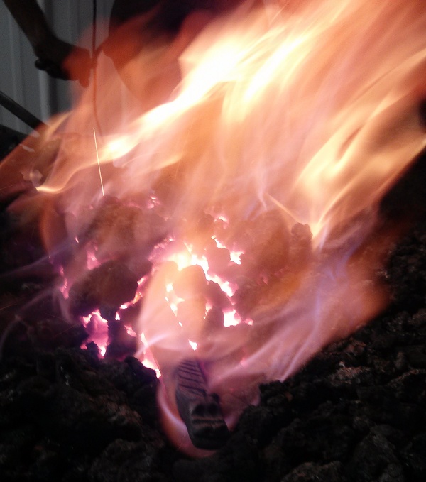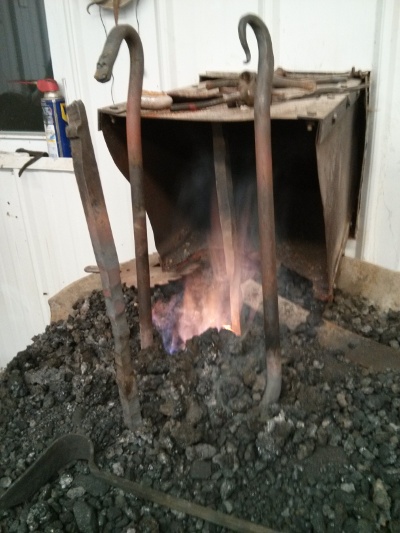 Gratuitous image of the fulcrum with dragon already forged being heated up in an effort to remove some of the rust scale off the main beam.