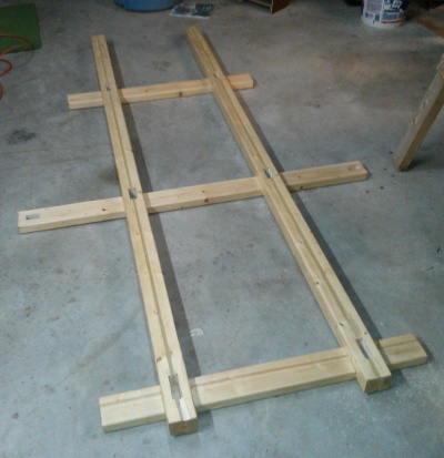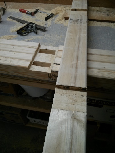 Here you can see one of the feet (on top) with rabbits cut out over the main bottom frame beams with matching rabbits. There are four main beams because we glued 2 2x4s together into a 4x4, so the 4 beams