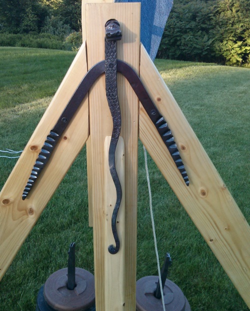 Little dragon faces are forged into the ends of the different bars of steel that make up the fulcrum and counterweight box.
