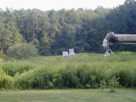 Our first shot, launched at 29 degrees threw about 270 some odd feet. We plugged that into a simple simulation I wrote, and predicted that we needed 19 degrees to hit the target. That time the 14lb rock landed right at the target line, but to the left. We raised the machine 2 degrees, and that rock flew way over the targets. We lowered the machine 1 degree, and that rock flew way over the targets. We went back down to 19 degrees, and that one went over the targets. We decided things weren't that easy.