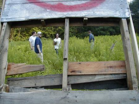 This is a view through the hole we made. Left to right is Kevin, the PA, Camera Man B, and the host Hunter, looking for lost rocks.