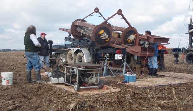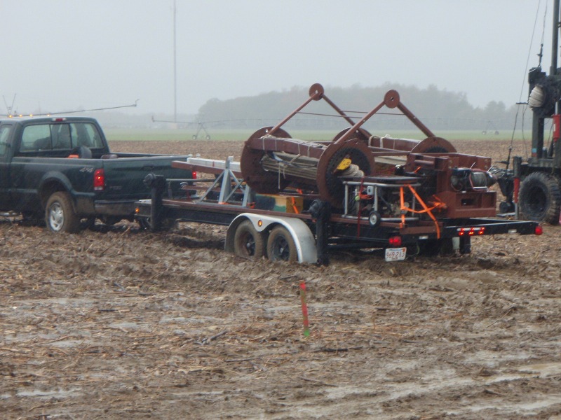 On Friday the sun came out, but the field was still a giant mud pit. We then put chip-board down on all the corn husks and started setting up Mr. B. We were in pit 109 of 110 pits, so we had the entire day to ourselves for finishing our setup. In this picture, Jeff runs the hydraulics to raise the dumpframe a little so we could drag the bundles to the front of the machine. You can also see all the corn husks we imported, and the mud pit where we didn't.