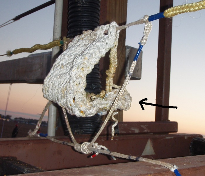 We not only pied our shot, but broke our bowline! In this picture, you can see that the bottom corner of the pouch is no longer attached to the bowline itself. The intermediate line broke through at the end of the throw, likely causing much harm to the pumpkin as well!