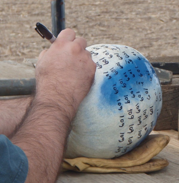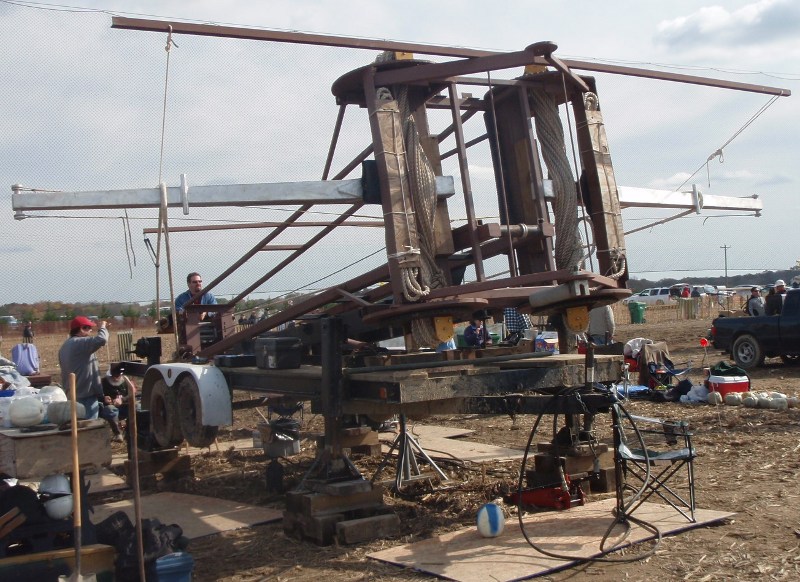 Sunday morning, the torsion team got together and petitioned the WCPCA president John Huber to see if the Citron (African Pumpkin) would be a legal projectile or not. Kim of Roman's Revenge had brought an entire crate of them to the chunk, so the whole torsion lineup then agreed to to use these new solid pumpkins for their last and final throw of the season.