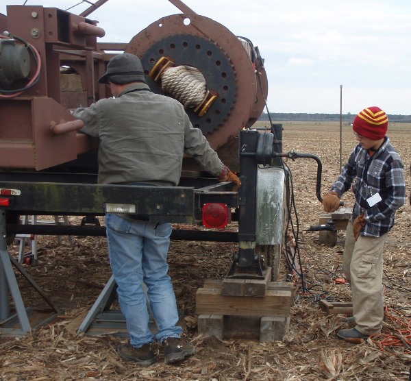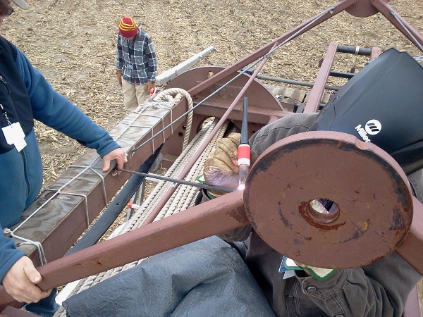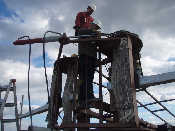 Kevin Cheney and Eric desperately try to put the just completed bowline onto the machine. The measuring crew was just finishing up the previous machine and was walking over, and our bowline had never been fitted to the machine before! Fortunately, my pinky measures did the trick and everything fit up nicely!