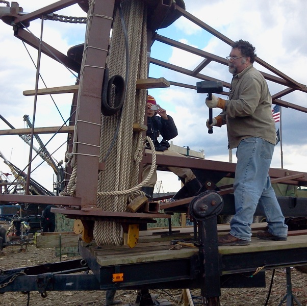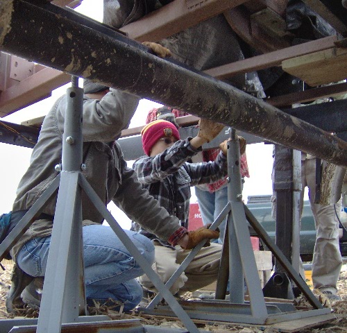 In this image, junior team member Trevor cranks on the big foot after the cribbing was installed. You can see the jack stands behind Eric's legs in this picture.