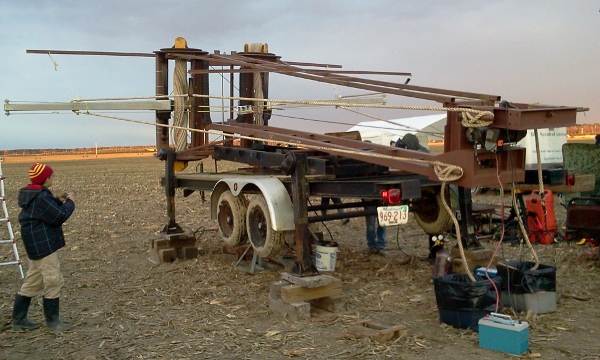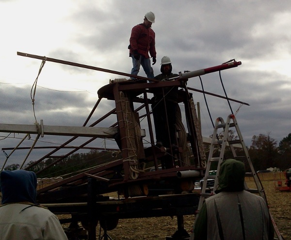 Bright and early on Friday we started removing travel bolts holding Mista Ballista in travel mode. In this picture, Dave uses his big drill to drive the front landing gear lifting the machine to maximum.