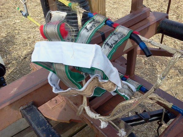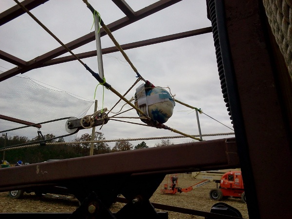 Here you can see our seacatch, our velcro/nylon pouch, the punkin' seat-belt, and bowline separators. The separators ended up being pretty dangerous. Check out the video below and you can see one getting launched backward into the crowd. Good thing there is a giant net back there.