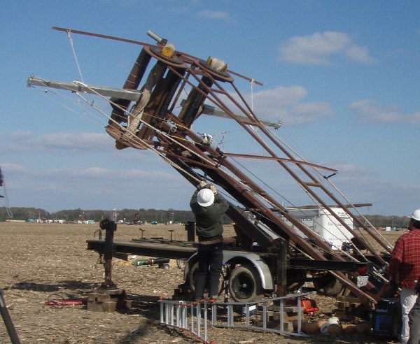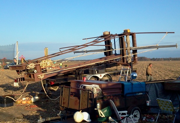 Our drive to Delaware was hindered by Superstorm Sandy, causing us to arrive late. We planned ahead, and Mr. B left it's field before the storm hit and the field got soft. On the way down, however, the ballista tow vehicle started to run out of gas in Jersey, and the lines were incredibly long. Later we learned many people were in line for 4 or more hours! Fortunately, we had a spare 14 gallon tank for use with our small engines, and we used that to keep going to southern Jersey where the lines were shorter, only a 1/2 hour!