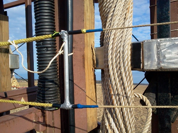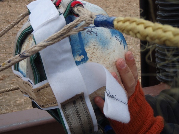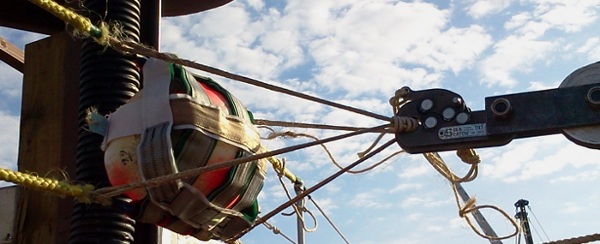 To prevent hurling the bowline separator off into the crowd again, Kevin Cheney drilled a 3rd hole into it, and we put a 'keeper line' on it. The line was left loose so it would catch it as it tried to get hurled somewhere. We also applied the universal solution of duct-tape over the ties to see if that might help.