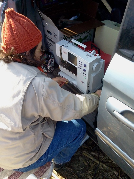 Fortunately, Amy had brought her sewing machine! We set her up in the side of the minivan, ran power over from the generator, showed her the damage, and she said "Again?". Inspection showed the thread she had used last year wasn't up for the task, so we borrowed some Kevlar thread from team Ethos. Unfortunately, the needle broke and Amy had to start sewing by hand. Running needles through old seat belts and velcro is pretty tough, and at one point the dull end of the needle stabbed through Amy's finger while she was pushing on it. Ouch! She adopted a hammer, and started using that instead. Fortunately for everyone, she managed to finish the task and get the pouch ready! What a trooper!