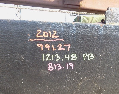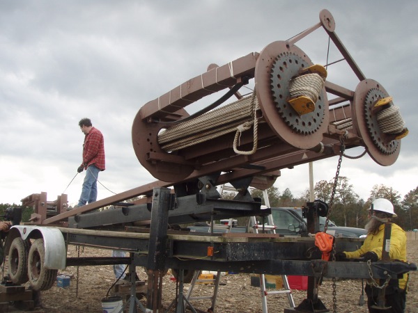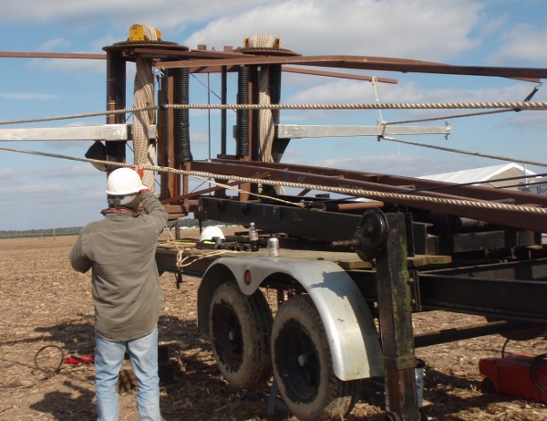 Next, we drag the bundles to the front of the machine using our winch. We drag it forward to marks we've painted on the machine, and then use a 3-ton come along to tip the bundles up into place. In this picture, you can see the faint orange triangle on the scapus underneath the bundles that mark the tipping point.