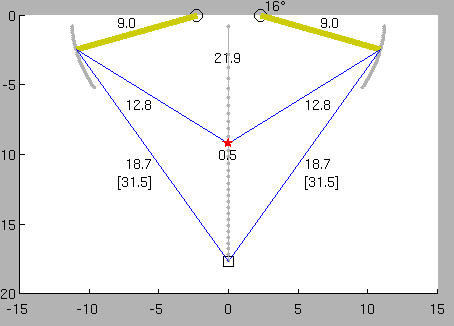 This diagram shows the basic idea behind compounding Mista Ballista. The pumpkin (the red star) is shown partway up the scapus. The arms (yellow) are about 9ft long from the bundle core. The overall arm sweep will be shorter because the bowline spools around the arm tips, and is extended to, and anchored at the winch at the back. As the arms are pulled back, the rope spools over the arm tips into the middle part of the bowstring, allowing the pumpkin to travel farther down the scapus per degree of arm rotation. If the arms rotate as quickly compounded as normal, that means the pumpkin will be moving even faster!