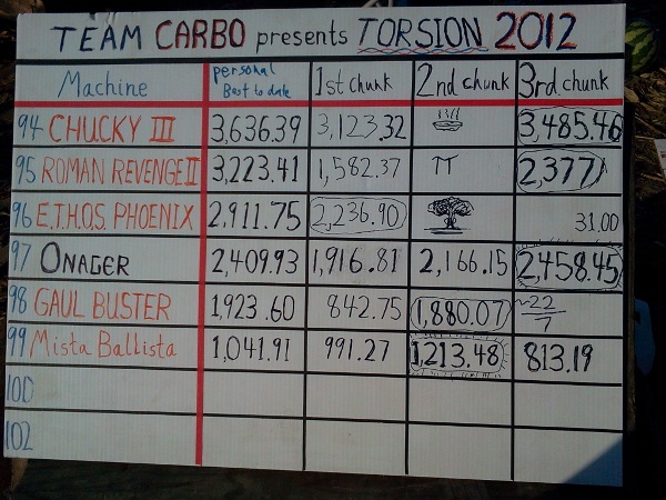 The torsion class had a great year with every machine throwing over 1000ft, Chucky III broke 3000 ft again, and spectacular failures on almost every machine on the field.