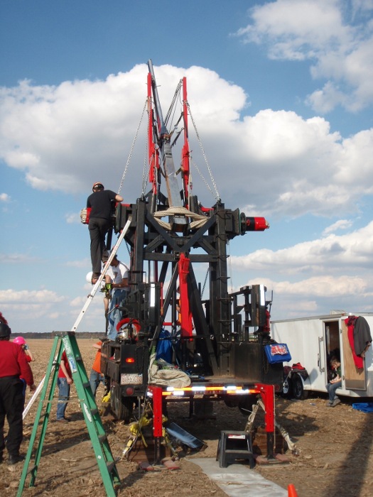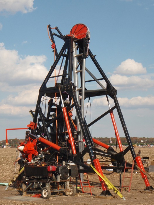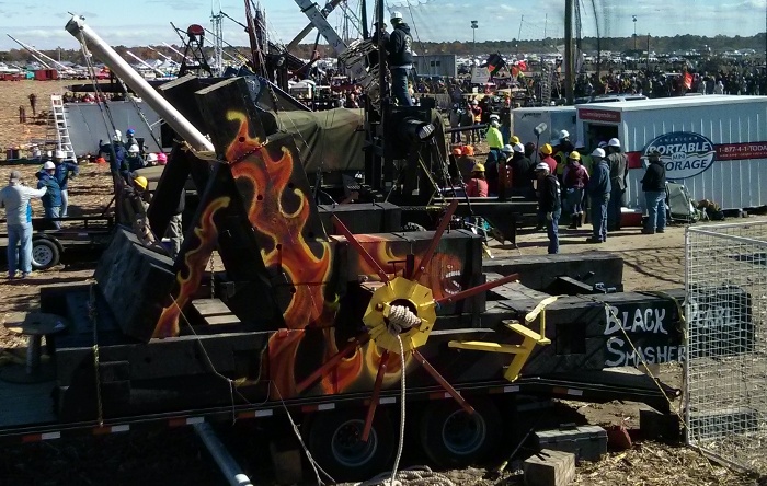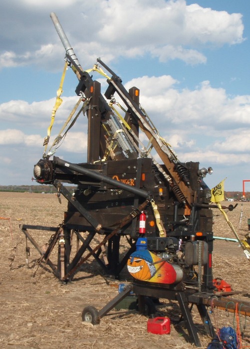 1542.30 ft Roman Revenge owner Kim had a bad fall on Friday when a torsioning winch line broke, and the tackle block was launched through his ladder and 50 ft out into the field. The team scratched their first shot of the competition while he went to the hospital. He was a real trooper though and was back later that day and finished setting up his machine. On day two they pied their 2nd shot, but then on Sunday they got off a reasonable shot securing 3rd place.